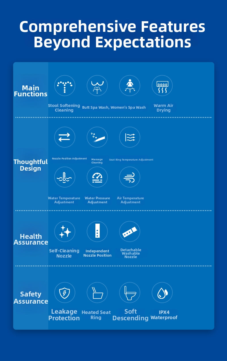 灌腸/便秘緩解:專用灌腸功能(或腸道清潔),旨在溫和地刺激腸道,使排便更輕鬆、更健康。